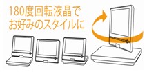 BDならではの高画質な映像を引き立たせ、映画の字幕などの細かい文字も読みやすい、9V型高精細LEDバックライト液晶パネルを搭載。また、画面が180度自在に回転するので、見やすい方向に画面の向きを変えたり、画面を表にして折り畳んだり、視聴環境に応じてお好みのスタイルでご使用いただけます。