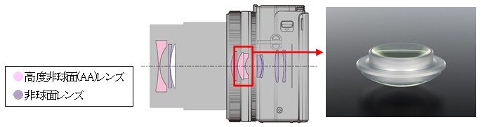 レンズとセンサーを最適に調整できるレンズ一体型ならではの利点を生かし、優れた描写性能を実現しました。新規設計の光学系には、高度非球面レンズ(AA - advanced aspherial)3枚を含む非球面レンズ9枚を採用するとともに、世界で初めて※3ガラス非球面レンズ2枚を高精度に接合することで、より広角で明るいレンズとレンズユニットの小型化を両立しています。また、ZEISS T*コーティングを採用し、ゴーストやフレアを大幅に低減します。さらに、7枚羽根の円形絞りが美しいぼけを生み出します。
