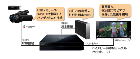 本機は、H.265/HEVC対応デコーダーを内蔵しており、別売の124/128度CSデジタル放送アンテナ(スカパー!プレミアムサービス対応)と、4K対応ブラビアに接続することで、次世代放送推進フォーラム(以下、NexTV-F)が10月から放送枠を拡大する4K試験放送「Channel 4K」や、スカパーJSAT株式会社が「スカパー!プレミアム」内に2015年3月に開局する4K専門チャンネルを視聴できます※1。また、お好みの容量の外付けHDDをUSB接続することで、これらのコンテンツを4K画質で録画可能です※5。さらに、株式会社アクトビラがインターネット上で2015年2月4月※(予定)から有料配信を開始する4K VOD配信サービス「4Kアクトビラ」についても、サービス開始後に予定している本体アップデートにより視聴が可能になります。(※2015年2月26日改訂)