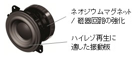 約35mm口径フルレンジスピーカーユニットを搭載し、高磁力ネオジウムマグネットにより磁気回路を強化。コンパクトボディながら、大音量時も低域の表現力をキープできます。また、ハイレゾ再生に最適な振動板を新たに採用。スピーカーユニット単体で、60Hzの低域から40kHzの高域までを豊かに再生することが可能になりました。