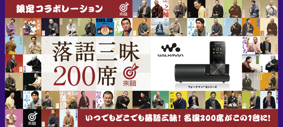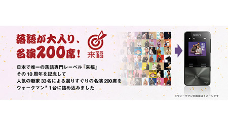 ソニーマーケティング株式会社は、株式会社ソニー・ミュージックダイレクトの落語専門レーベルである『来福』発足10周年を記念して、『来福』とコラボレーションしたウォークマン®Sシリーズ「落語三昧200席」の注文受付を開始します。桂歌丸、春風亭一之輔、立川志の輔、立川志らく、柳家花緑(50音順)他、来福の保有する人気噺家たちの落語音源の中から選りすぐった200席がプリインストールされているウォークマン®Sシリーズには専用のスピーカーが付属しており、着いたその日からお部屋でも、ヘッドホンでもお楽しみいただけます。