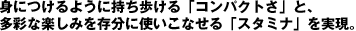 | 高密度化技術とバッテリー容量のアップにより、コンパクトな本体でスタミナ最大5.5時間*と軽量1.39kg(標準バッテリー使用時)を実現。さらに別売のLLLバッテリーを使えば最大11時間*ものスタミナを発揮。いつも身につけて存分に楽しめる「バイオ」です。 |