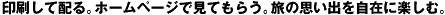 | ホームページも印刷同様、「トラベルレポート」、「コレクションマップ」の2通 りのHTMLファイルを作成できます。作成したHTMLファイルはそのままホームページにアップロードでき、多くの人たちと旅の感動を共有することができます。 |