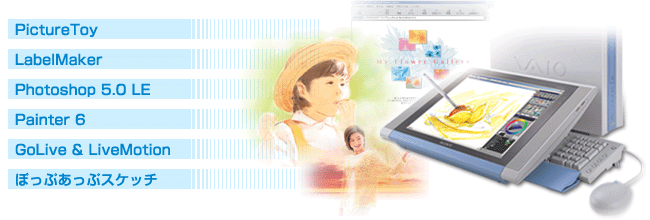 PCV-LX92G/BP・LX82/BPにはもれなく、液晶ペンタブレットの使い方や楽しみ方をわかりやすく紹介したソニーオリジナルの解説書「バイオで楽しく!!液晶ペンタブレットで遊ぼう」を付属しています。 |