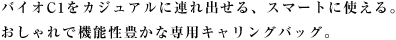 LUGGAGE LABEL、PORTERなどのブランドでおなじみの「吉田カバン」(株式会社 吉田)とソニーの共同開発で生まれた「スマートバッグCX」。バッグとしての基本性能はもちろん、バイオC1を持ち歩くための使いやすさを徹底して追求。カジュアルなスタイルの中に、モバイルのための機能性を豊富に備えました。