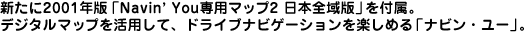 | デジタルマップを活用した充実の機能を誇る「ナビン・ユー」。新たに2001年版「Navin' You専用マップ2 日本全域版」地図ディスクを付属しました。ハンディGPSと連携したリアルタイムでのドライブナビゲーションをはじめ、目的地までの複数ドライブルート探索など、多彩なドライブナビゲーションを実現。また、「ナビン・ユー5 2001エディション」への進化により、「乗換案内」と連携したトラベルルート探索や、カーナビゲーションシステムと連携したデータの共有、「クリエ」への地図の切り出しも可能に。デジタルマップならではの便利な機能を豊富に搭載し、さまざまなシーンで活躍します。 |