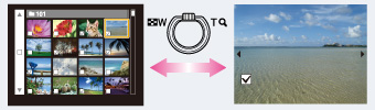 一覧表示、1枚再生を切り換えながら選ぶには一覧表示時にT側(