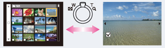 一覧表示、1枚再生を切り換えながら選ぶには一覧表示時にT側(