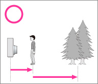 イラストのように被写体に近づき、被写体と背景の距離は大きくとってください。暗すぎるシーンや動きのある被写体を撮影した場合、またAE/AFロック後にカメラを動かした場合は、3D効果がはっきり出ない場合があります。また、暗い場所で撮影した場合、ノイズが強調されることがあります。