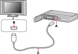 本機のHDMI端子(A)とテレビのHDMI端子(B)をHDMIケーブル(別売)(C)で接続する