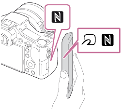 の付いたスマートフォンはNFC対応しています。詳しくはスマートフォンの取扱説明書でご確認ください。 - 「PlayMemories Mobile」が起動するまで(1〜2秒)タッチし続けてください。