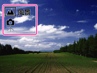 おまかせシーン認識では、シーンを認識したときと状況を認識したときでマークの出る位置が異なります。認識されたシーンは、上段に