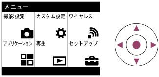 撮影、再生、操作方法など、カメラ全体に関する設定を変更したり、カメラの機能を実行します。