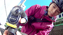 サイクリング時は、雨の日もあるし晴れていても路面が濡れていて、前走者のタイヤから水が飛んで来ることもある。アクションカムは、ウォータープルーフケースに入れられるので防水は完璧。また万が一、カメラを取り付けた状態で転倒してしまうことがあってもカメラ自体を保護できるので安心です。自転車用のハンドルバーマウントは、各種のハンドル径にも対応していて、さまざまなハンドルに付けることができ、かつ取り付けもカンタンでした。