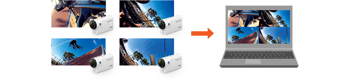 たとえばアクションカムを4台使い、自分視点や自分撮り、周囲の風景などを撮影。Action Cam Movie Creator(アクションカム ムービークリエイター)で4台の映像を組み合わせて1画面で同時に表示した動画をかんたんに作成、別ファイルとして保存できます。多視点が一度に見られるユニークかつ迫力ある映像を、Web上で公開・シェアできます。