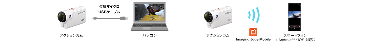 アクションカムとパソコンを付属のマイクロUSBケーブルで接続して、パソコンへの画像の取りこみや再生がかんたんに行えます。また、お持ちのスマートフォン/タブレットにImaging Edge Mobileをインストールすれば、アクションカムからスマートフォン/タブレットで手軽に楽しめます。Wi-Fi経由で画像を転送し保存することもできます。