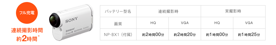 付属バッテリー(NP-BX1)を満充電した場合、連続撮影時間は約2時間(*)。動きのある印象的なシーンを長時間撮影することができます。