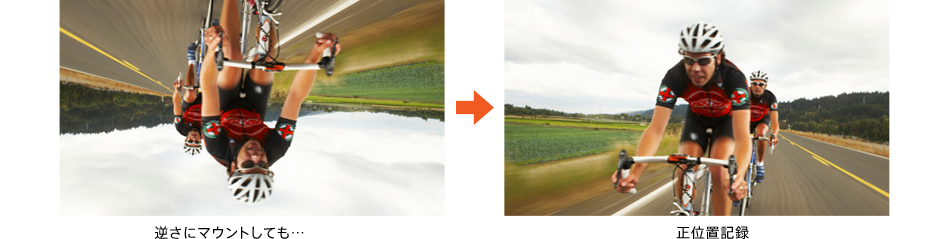 モード設定をオンにして上下を反転して記録できる上下反転モード。本体を逆さにマウントしても上下が正位置で記録できます。また、スマートフォン/タブレットのモニターも反転表示できます。