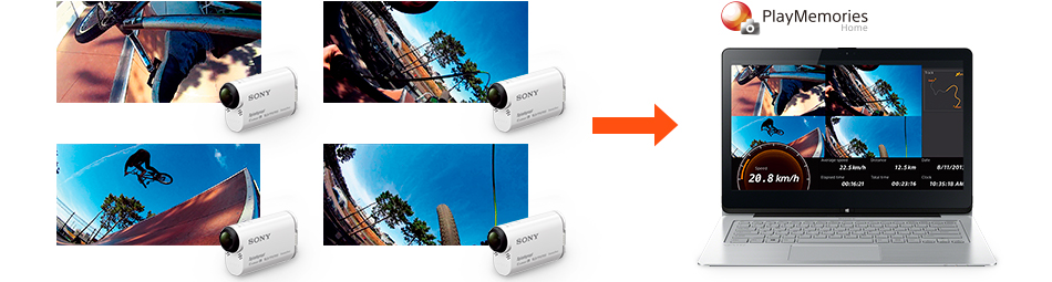 たとえばアクションカムを4台使い、自分視点や自分撮り、周囲の風景などを撮影。PlayMemories Homeで4台の映像を組み合わせて1画面で同時に表示した動画をかんたんに作成、別ファイルとして保存できます。多視点が一度に見られるユニークかつ迫力ある映像を、Web上で公開・シェアできます。