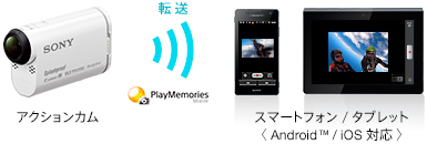 お持ちのスマートフォン/タブレットにPlayMemories Mobile(プレイメモリーズモバイル)をインストールすれば、アクションカムからスマートフォン/タブレットにWi-Fi経由で画像を転送して手軽に楽しめます。