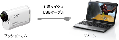 アクションカムとパソコンを付属のマイクロUSBケーブルで接続して、パソコンへの画像の取りこみや再生がかんたんに行えます。