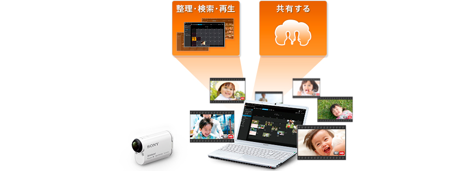 アクションカムとパソコンをつなぐだけで、カメラ内の映像を取りこまなくても見ることができます。また、外付けハードディスク、PlayMemories Online(プレイメモリーズオンライン)にある映像もかんたんに閲覧できます。