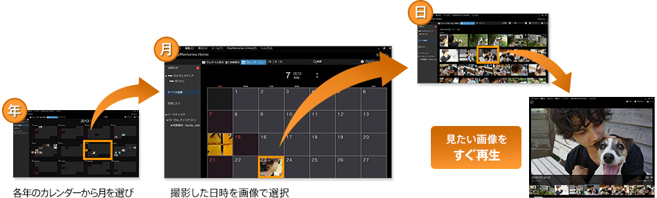 「カレンダー表示」機能を使えば、撮った映像をかんたんに整理・検索・再生できます。アクションカムとパソコンをつなぐだけで、カメラ内の映像を取りこまなくても見ることができます。