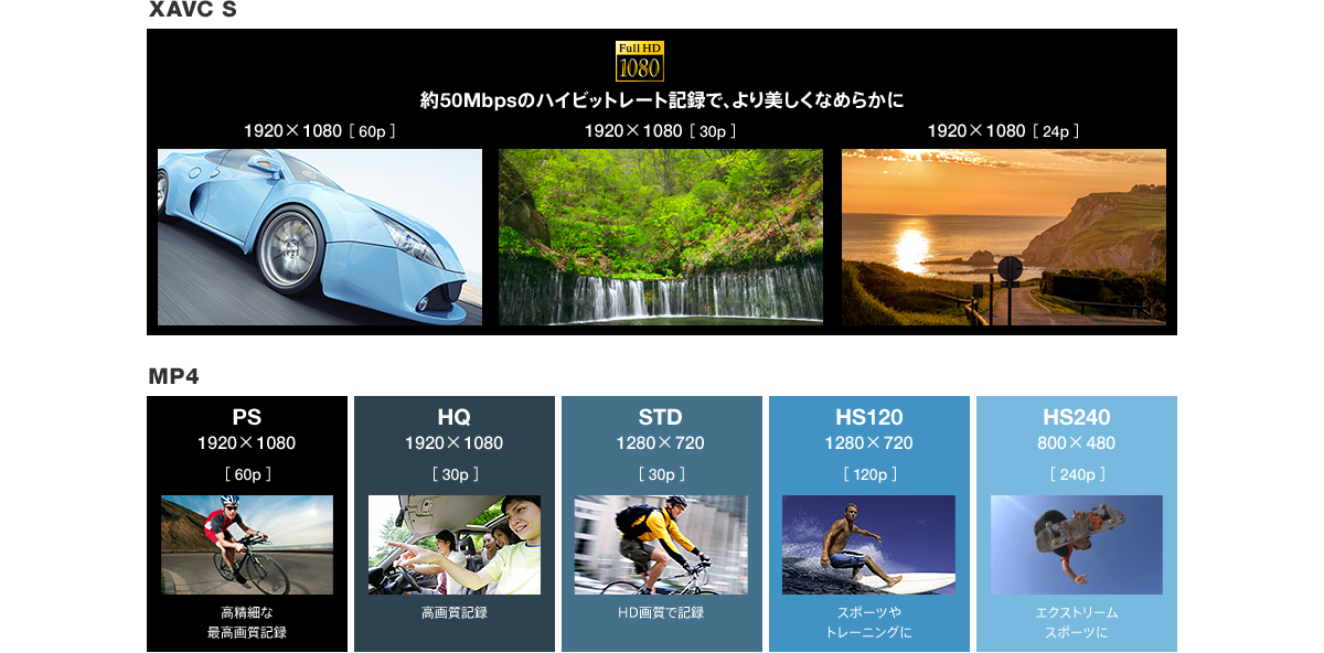 ※ XAVC S記録時はmicroSDHC/SDXCメモリーカード(Class10以上推奨)が必要です