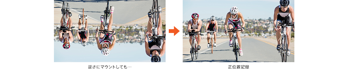モード設定をオンにして上下を反転して記録できる上下反転モード。本体を逆さにマウントしても上下が正位置で記録できます。また、スマートフォン/タブレットのモニターも反転表示できます。