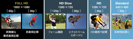 1920×1080 60pのフルHD画質の高精細な高画質で残せるPSモード、1920×1080 30pのフルHD画質の高画質で残せるHQモード。1280×720 30pのHD画質のSTDモード。同じくHD画質で2倍スローのSLOWモード、4倍スローのSSLOWモード。640×480 30pのSD画像で長時間記録できるSDモードが選べます。