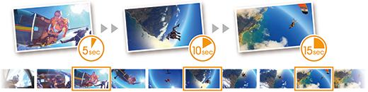 被写体の動きを定期的に撮影できる「インターバル静止画記録」。撮影間隔を5秒・10秒・30秒・60秒と選べ、さまざまなアクションの動きを動画だけでなく、静止画で確認したい、残しておきたいといったときや、長時間の連続記録に便利な機能です。