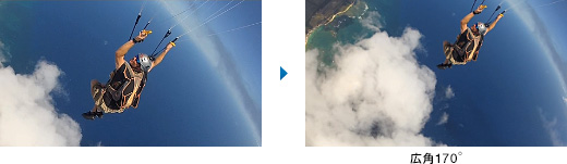 目の前の風景をよりワイドに、より鮮やかに撮影するために広角170°(*)、スピード感を演出するために広角120 °と画角の選択が可能。シーンに合わせて迫力映像を実現します。ゲレンデからの眺望や、マウンテンバイクで山道を走るときなどの撮影におすすめです。