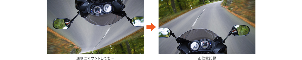 モード設定をオンにして上下を反転して記録できる上下反転モード。本体を逆さにマウントしても上下が正位置で記録できます。また、スマートフォン/タブレットのモニターも反転表示できます。