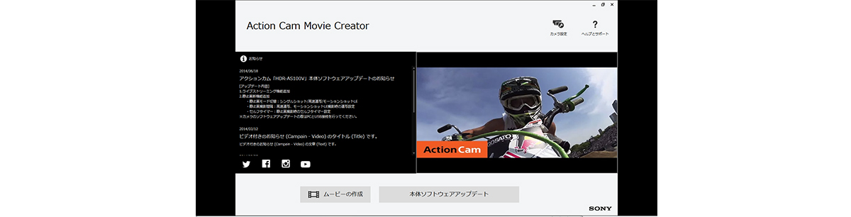 Action Cam Movie Creator(アクションカム ムービークリエイター)は、アクションカムで撮影した映像の編集を、カンタンに行える専用ソフトです。映像の「切り出し」、「スロー」、「早回し」、「繰り返し」などがカンタンに行えるため、複数の素材をつなげた映像作品が手軽に完成。動画サイトへアップロードしてシェアする場合などに便利です。さらに、カメラのアップデートがある場合にはお知らせ機能があり、アクションカムを最新の状態に保つことをサポートしてくれます。また、Action Cam Movie Creator(アクションカム ムービークリエイター)インストール時に同時インストールされるPlayMemories Home(プレイメモリーズ ホーム)は撮りためた動画・静止画を管理するのに便利です。