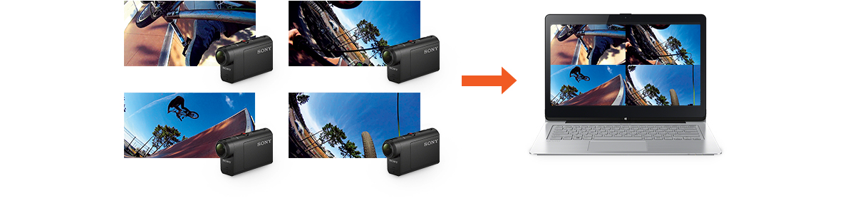 たとえばアクションカムを4台使い、自分視点や自分撮り、周囲の風景などを撮影。Action Cam Movie Creator(アクションカム ムービークリエイター)で4台の映像を組み合わせて1画面で同時に表示した動画をかんたんに作成、別ファイルとして保存できます。多視点が一度に見られるユニークかつ迫力ある映像を、Web上で公開・シェアできます。