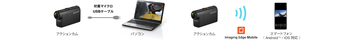 アクションカムとパソコンを付属のマイクロUSBケーブルで接続して、パソコンへの画像の取りこみや再生がかんたんに行えます。また、お持ちのスマートフォン/タブレットにImaging Edge Mobileをインストールすれば、アクションカムからスマートフォン/タブレットで手軽に楽しめます。Wi-Fi経由で画像を転送し保存することもできます。