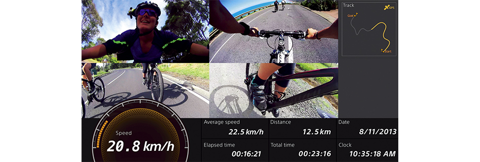 HDR-AZ1VR付属の「ライブビューリモコン」(RM-LVR2V)に搭載したGPS情報をAction Cam Movie Creator(アクションカム ムービークリエイター)で活用することにより、多彩な表示スタイルを実現。マルチビューを使えば、スピードや移動時間、移動距離、軌跡などを動画に表示できます。このマルチビューを使った映像は別のファイルとして保存できるのでWeb上で公開・シェアする楽しみがさらにひろがります。