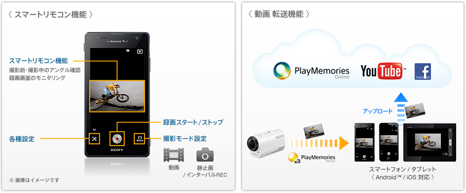 コンパクトな本体にWi-Fi機能を搭載。(無料)モバイルアプリのPlayMemories Mobileを使えば、Wi-Fi経由でお使いのスマートフォンやタブレットで「撮影前のアングル確認」「録画中のモニタリング」「カメラのリモコン操作」ができます。本体を自転車やヘルメット等に装着した場合にスマートフォンの画面をモニターがわりにしてアングルを確認することもできます。また、撮った動画をスマートフォンやタブレットに転送し、YouTube(TM)、Facebook、PlayMemories Online(プレイメモリーズオンライン)などにアップロードして、友達や家族とシェアできます。