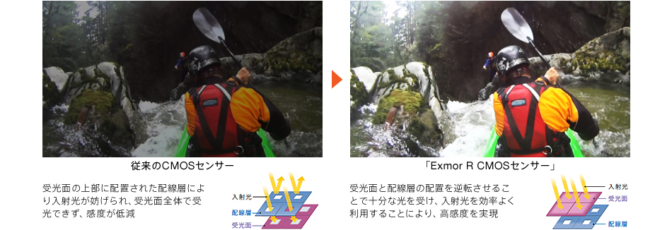 総画素数約1,680万画素(有効約1,190万画素)(*)のイメージセンサー「Exmor R CMOSセンサー」搭載により、高精細な映像を実現。また、夜景や暗い場所での撮影に威力を発揮。ノイズを低減し、美しく鮮やかに撮れます。