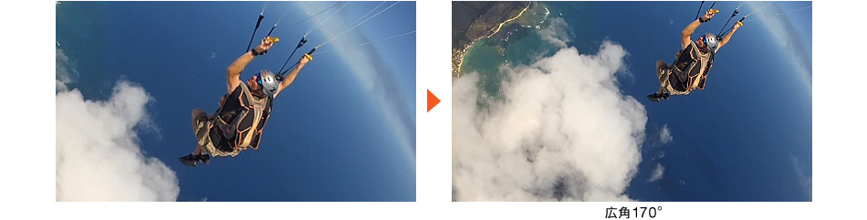 登山やハイキングで頂上からの眺望など、目の前の風景を広角でダイナミックに撮影したい場合は広角170°(*)、マウンテンバイクで山道を走るときなど、しっかりブレを抑えたい場合は広角120°とシーンに合わせて画角を使い分け、自分視点での斬新で臨場感たっぷりな映像が撮影できます。