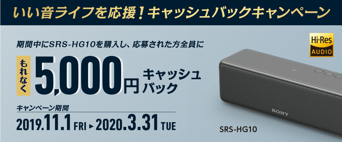 SRS-HG10 19冬-20春 キャッシュバックキャンペーン(以下「本キャンペーン」)では、キャンペーン期間(購入期間)内に対象商品を購入し、当社所定の手続きに従い応募期間内に不備なくご応募されたお客様に、5,000円をもれなくキャッシュバックいたします。