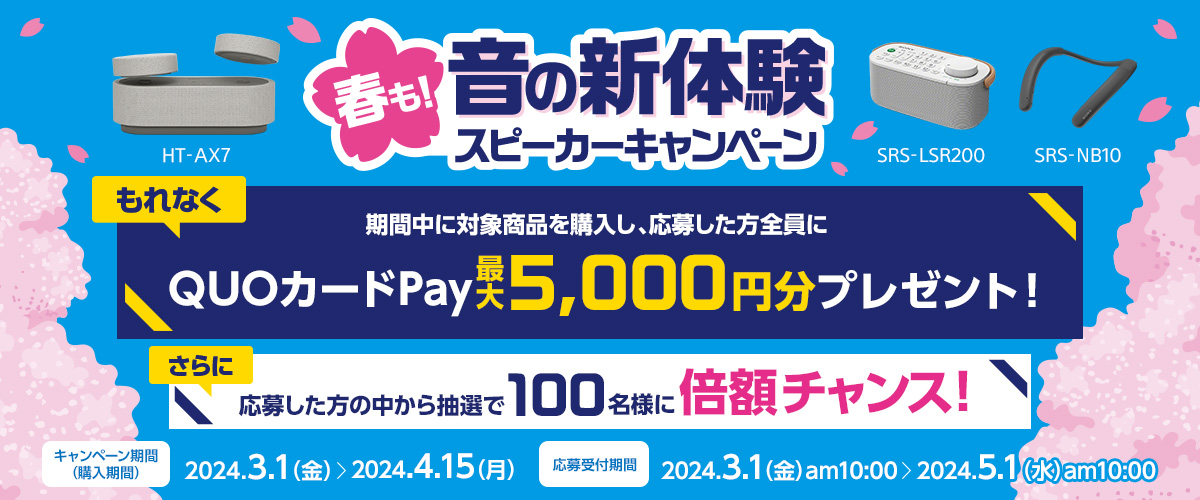 春も!“音の新体験”スピーカーキャンペーン(以下「本キャンペーン」)では、キャンペーン期間(購入期間)内に対象商品を購入し、当社指定の手続きに従い応募期間内に不備なくご応募されたお客様に、QUOカードPayをもれなくプレゼントいたします。