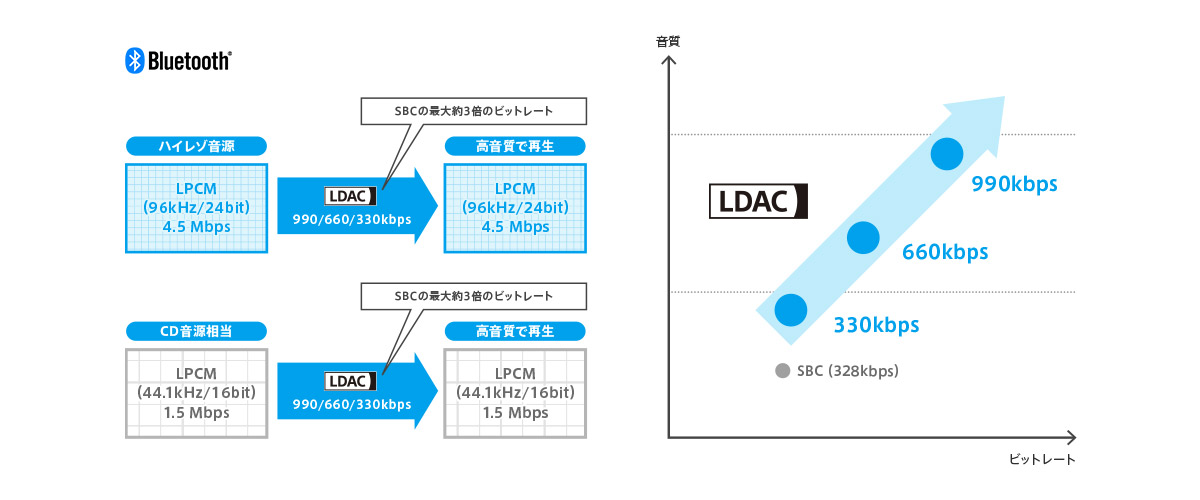 * Bluetooth A2DPのSBC(328kbps、44.1kHz時)との比較