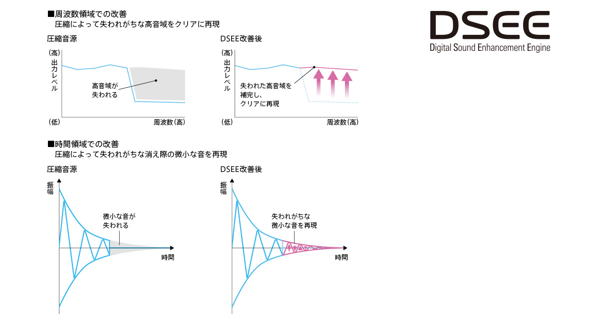 圧縮された音源で失われがちな高音域を効果的に補完する「DSEE」を搭載。MP3やBluetoothの伝送コーデックなどにより、圧縮された音源を原音により近い広がりのある音で再生します。圧縮率を上げても音質劣化が少なく、聴き疲れしにくい自然な音で楽しめます。