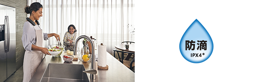 防滴仕様 IPX4(*)なので、水しぶきを気にすることなくキッチンで料理や洗い物をしながら気になるテレビ番組や音楽鑑賞を楽しめます。