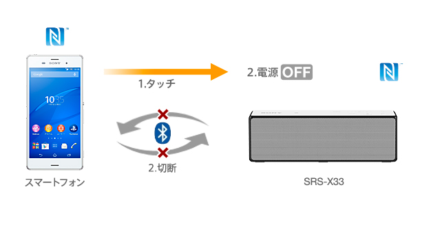 NFC搭載のスマートフォンや、おサイフケータイ(R)対応Android(TM)搭載スマートフォンなどをSRS-X33にタッチするとSRS-X33の電源がONになり、Bluetooth接続が完了します。