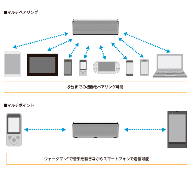 8台までの機器をペアリングすることができるマルチペアリングと、音楽再生機器(A2DPプロファイル)と通話機器(HFPまたはHSPプロファイル)に、それぞれ1台ずつ同時に接続ができるマルチポイントに対応しています。