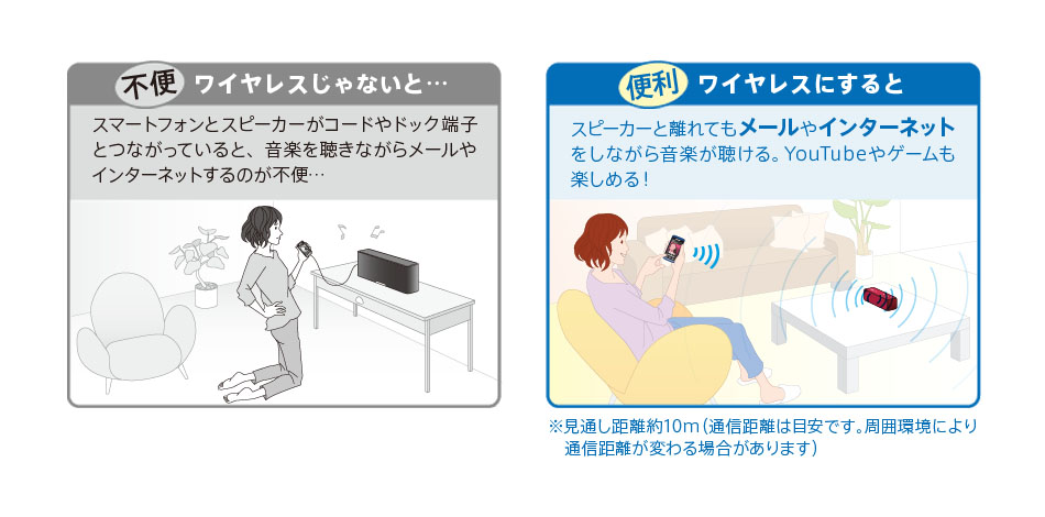 ワイヤレスで音楽を再生できるので、Xperia(TM)やiPhoneなどのスマートフォン、タブレットなどで音楽を聴きながら手もとでインターネットやTwitter、Facebookなどのアプリケーションを楽しんだり、YouTubeやワンセグなどの動画を、スピーカーの迫力のサウンドで楽しめます。