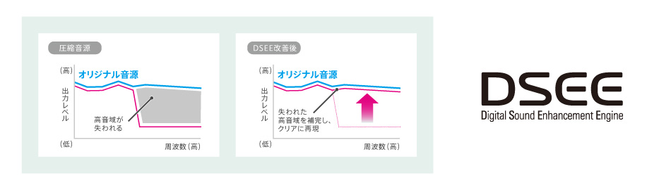 圧縮された音源で失われがちな高音域を効果的に補完する「DSEE」。MP3やBluetoothの伝送コーデックなどにより、圧縮された音源を原音により近い広がりのある音で再生します。圧縮率を上げても音質劣化が少なく、聴き疲れしにくい自然な音で楽しめます。