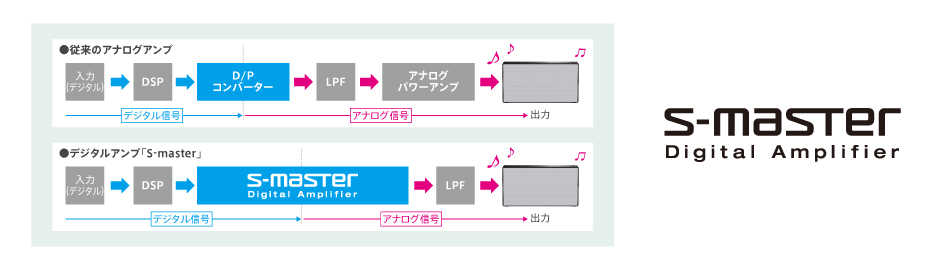ソニーが培ってきた高音質デジタルアンプ技術「S-Master」を搭載。音声信号をデジタル処理することにより、音のひずみを抑制。小音量から大音量まで、どのボリュームレベルでも、クリアで臨場感あふれるサウンドを再現します。また、高効率なスイッチング方式の採用により発熱が少なく、アンプ部の小型化が可能になりました。